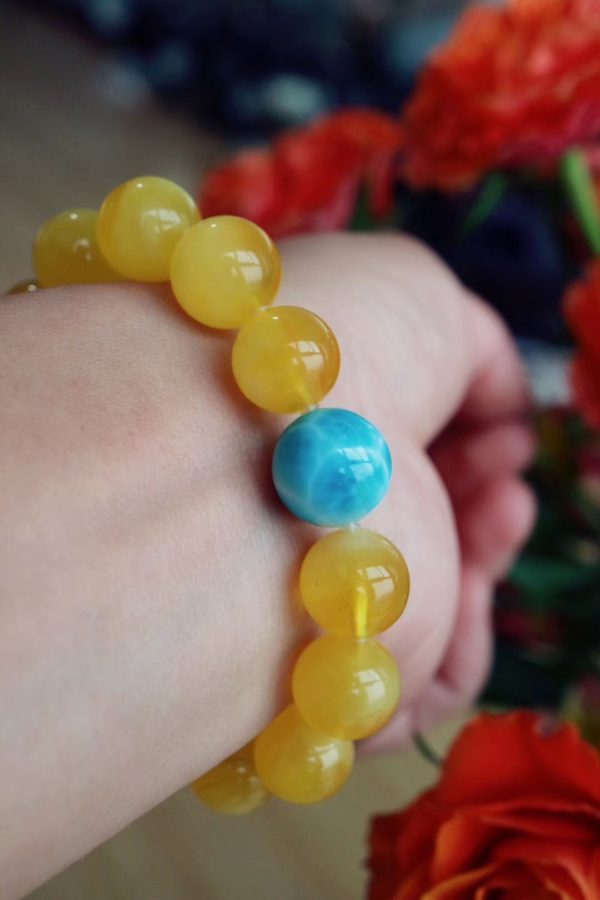 蜜蜡,天然的有机宝石,富含多种矿物质,还有独特的琥珀酸,消炎止痛,安神养身。关键是特别百搭,不管是搭配单珠,绿松蔷薇辉,海纹石,天河。。。还是和别的手串搭配色调,都特别棒!