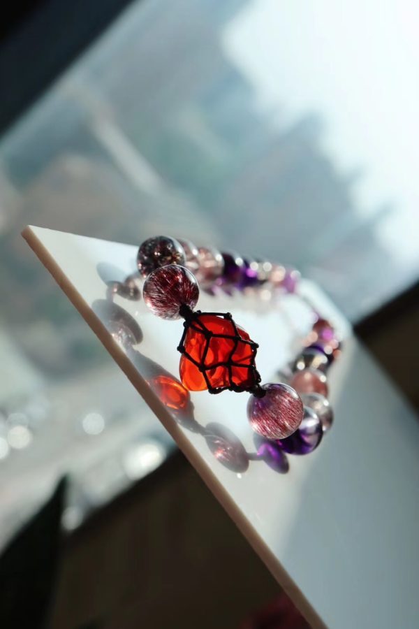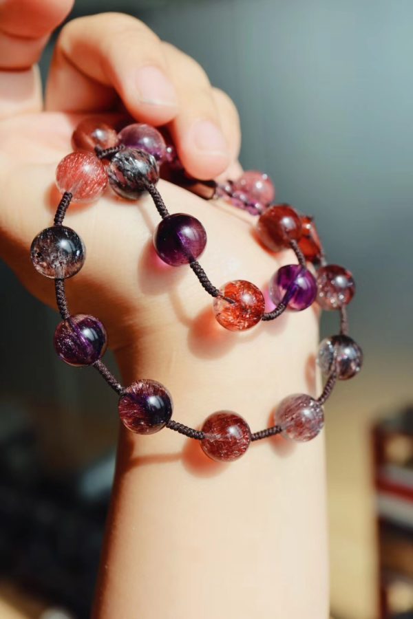 超级七水晶严格来说并没有一种统一的颜色,因为它是由七种不同的矿石组合而成的,里面包含白水晶、金红石、烟晶、紫晶、纤铁矿、针铁矿和黄磷铁矿等矿物,就连发丝都透出黑色、红色、紫色、银色、橙色、金色等不同的颜色。