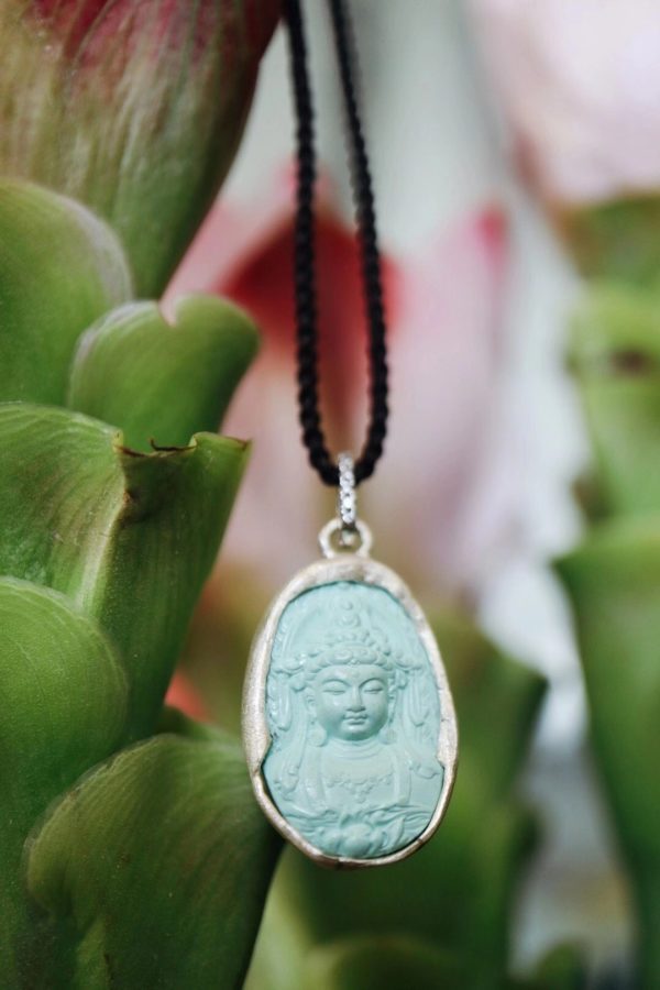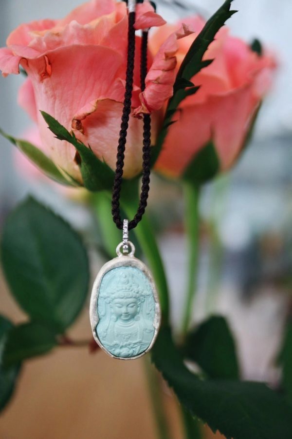 绿松石的色系属于高级色系,尊贵典雅,殊胜静谧。历史上多受皇权贵族,文人雅士所偏爱,更是在宗教中有着极特殊的地位。为了表示对佛祖的虔诚供养,往往要在佛造像和法器上镶嵌绿松石,而用绿松石直接雕刻造像,那便是殊胜之极,随身供养,即可消灾克难,善德福报!