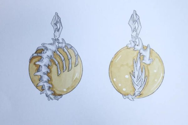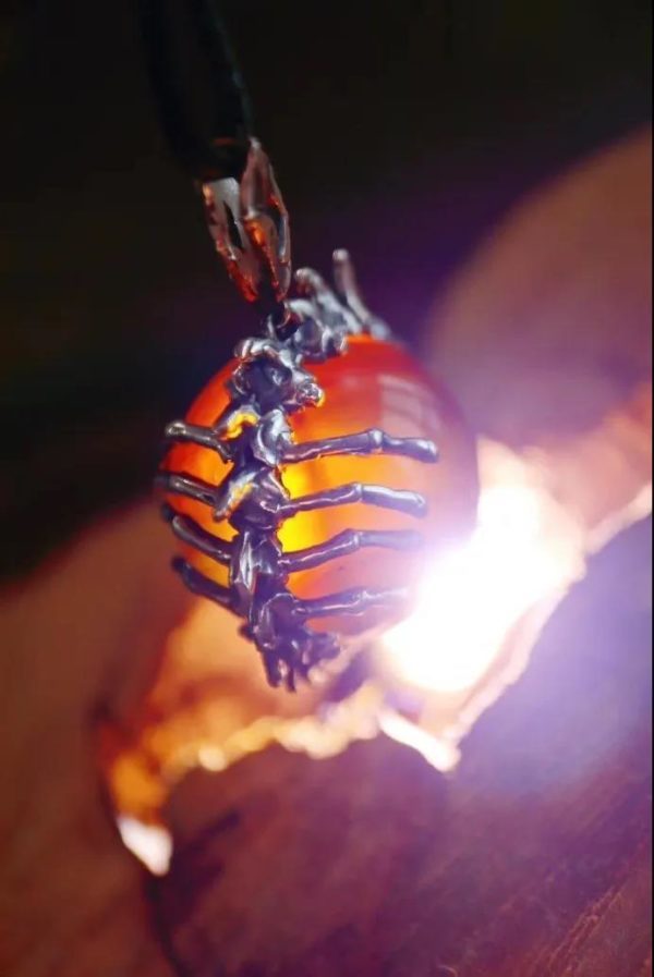 在吊坠的镶嵌方面,我不想将它与温柔精致的K金放在一起,所以我选用了纯银镶嵌的方式,只有手工镶嵌的做法才能与之相配。才能将吊坠的魅力表现的更大化,更独一无二。吊坠四周是绽开的一根根“骨干”张扬有力,肆意的附着在琥珀上面,每一处关节清晰可见。整个造型好像充满了力量,铮铮骨干,毅力与世上。