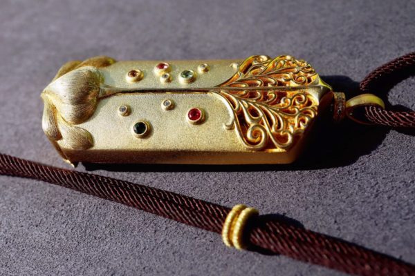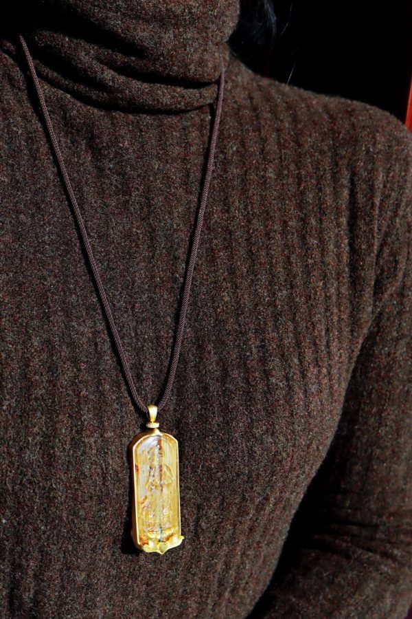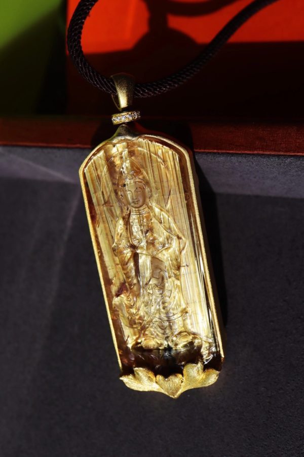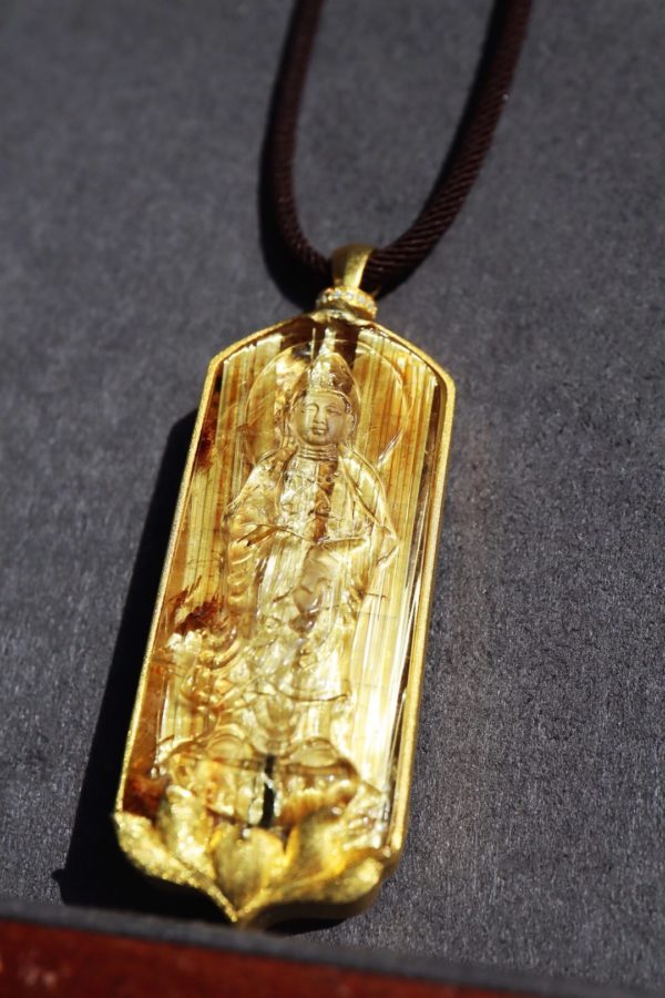 钛晶发丝板钛,金光闪闪。以钛晶雕刻药师佛,佩戴,可配合念药师佛心咒,驱邪同时强身健体。