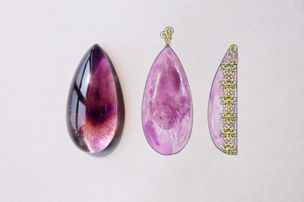 唐代壁画中的宝相花纹,传统纹样,是吉祥三宝之一,盛行与中国隋唐时期,宝相是佛教对于佛像的尊称,宝相花则是圣洁、端庄、美观的理想花形,含有吉祥、美满的寓意。这一颗紫发晶,用宝相花纹包裹,加持力满满。