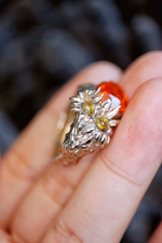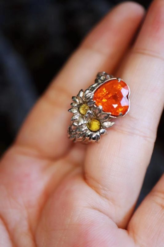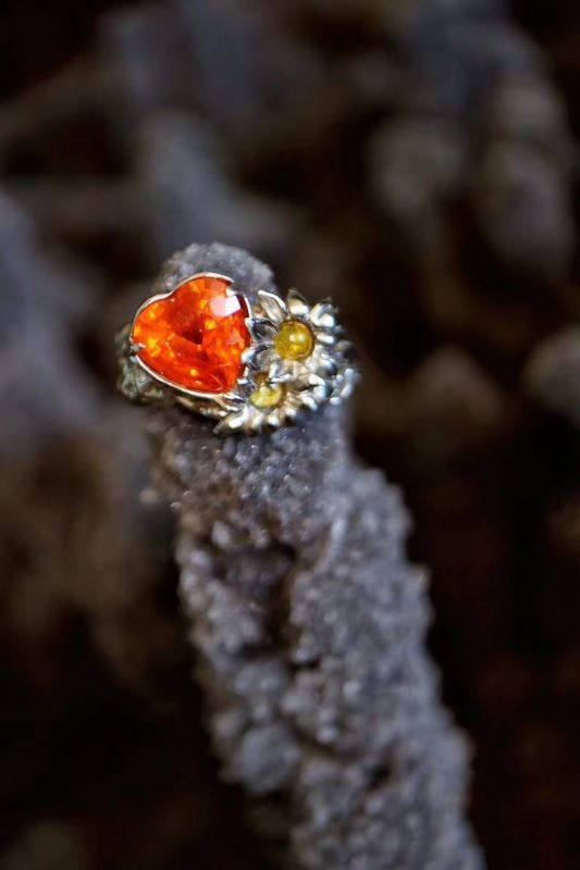 继续甜度超标的一天,芬达石的色系,充满了阳光的爱意,这个戒指是“橙子味道”的。配上小雏菊的花语:天真 和平 希望。用9k重金纯手工镶嵌,立体感和手工感,独一无二。🧡